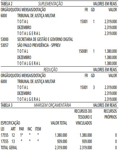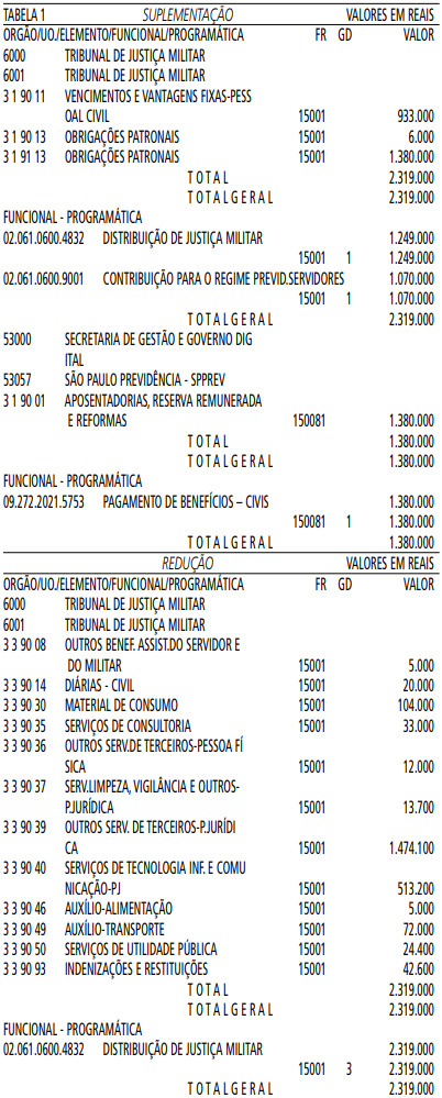 Artigo 1° - Fica aberto um crédito de R$ 2.319.000,00 (dois milhões trezentos e dezenove mil reais), suplementar ao orçamento do Tribunal de Justiça Militar, observando-se as classificações Institucional, Econômica, Funcional e Programática, conforme a Tabela 1, anexa.