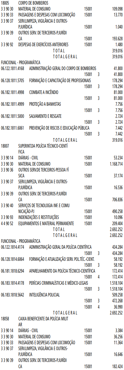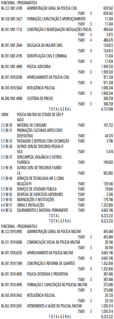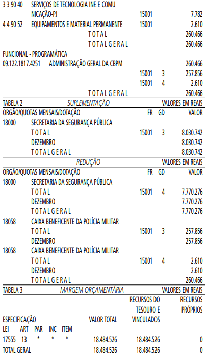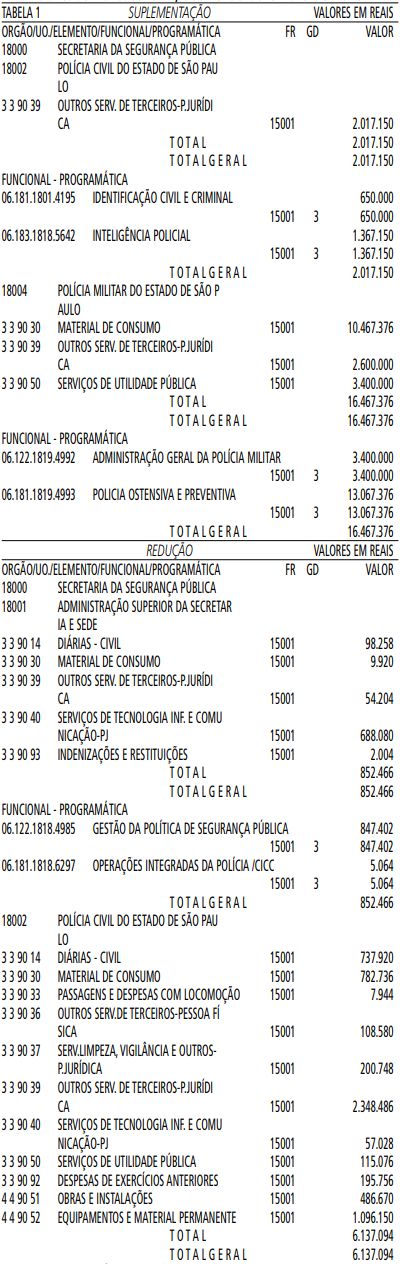 Artigo 1° - Fica aberto um crédito de R$ 18.484.526,00 (dezoito milhões, quatrocentos e oitenta e quatro mil, quinhentos e vinte e seis reais), suplementar ao orçamento da Secretaria da Segurança Pública, observando-se as classificações Institucional, Econômica, Funcional e Programática, conforme a Tabela 1, anexa.