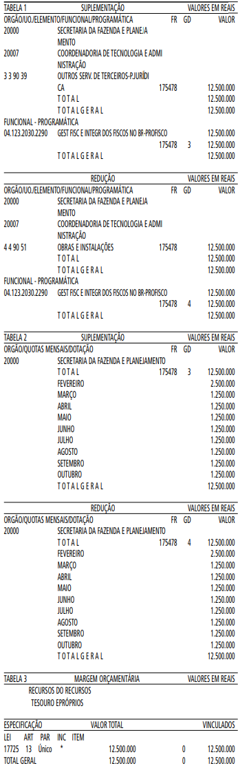 Artigo 1° - Fica aberto um crédito de R$ 12.500.000,00 (doze milhões e quinhentos mil reais), suplementar ao orçamento da Secretaria da Fazenda e Planejamento, observando-se as classificações Institucional, Econômica, Funcional e Programática, conforme a Tabela 1, anexa.