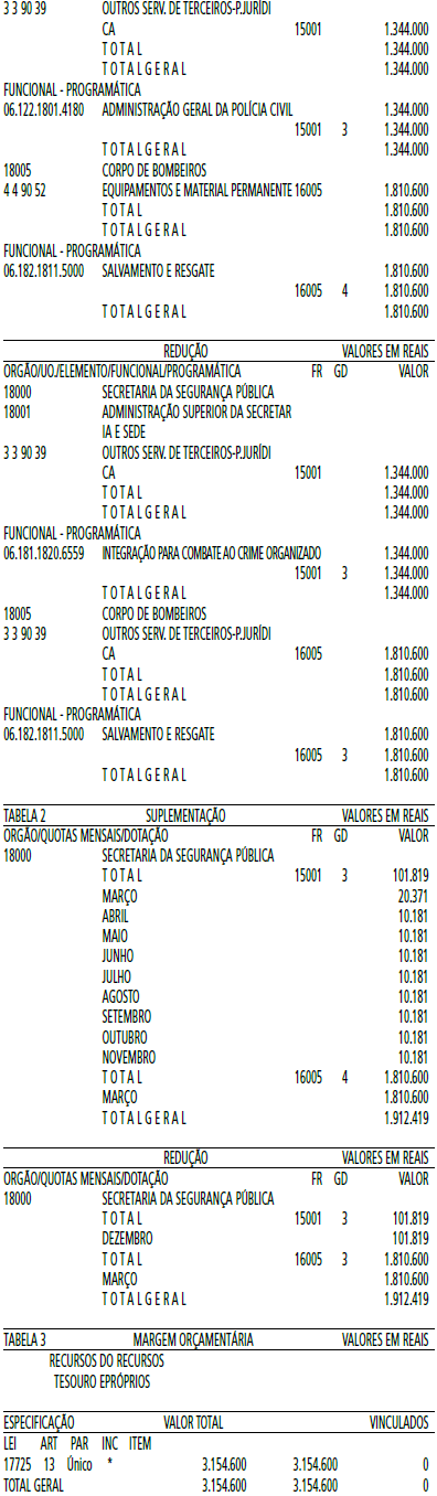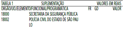 Artigo 1° - Fica aberto um crédito de R$ 3.154.600,00 (três milhões, cento e cinquenta e quatro mil, seiscentos reais), suplementar ao orçamento da Secretaria da Segurança Pública, observando-se as classificações Institucional, Econômica, Funcional e Programática, conforme a Tabela 1, anexa.