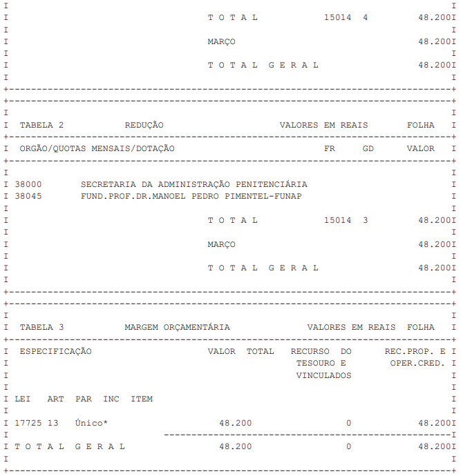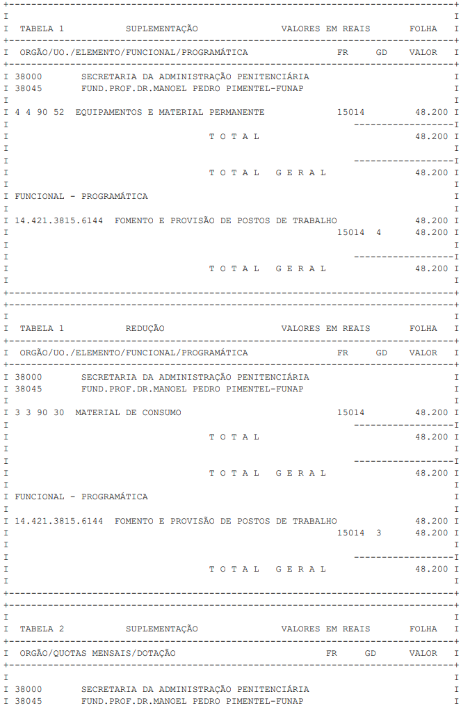 Artigo 1° - Fica aberto um crédito de R$ 48.200,00 (quarenta e oito mil, duzentos reais), suplementar ao orçamento da Fundação Professor Dr. Manoel Pedro Pimentel - FUNAP, observando-se as classificações Institucional, Econômica, Funcional e Programática, conforme a Tabela 1, anexa.
