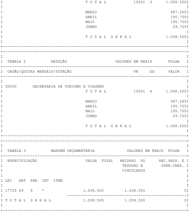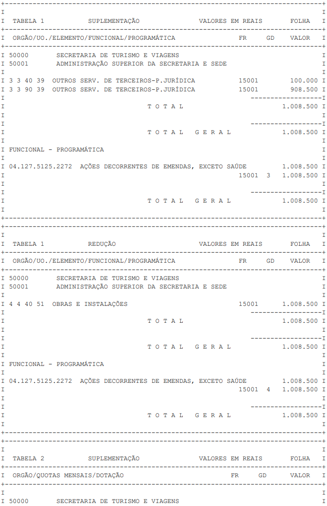 Artigo 1° - Fica aberto um crédito de R$ 1.008.500,00 (um milhão, oito mil, quinhentos reais), suplementar ao orçamento da Secretaria de Turismo e Viagens, observando-se as classificações Institucional, Econômica, Funcional e Programática, conforme a Tabela 1, anexa.