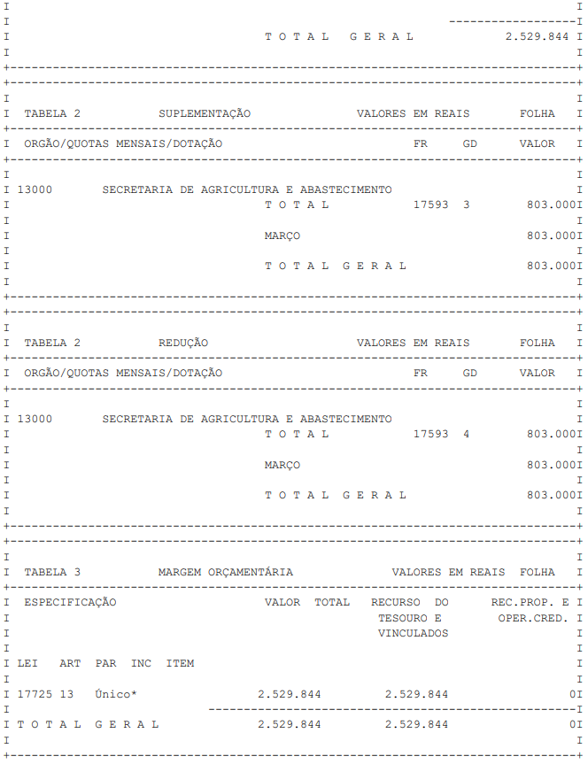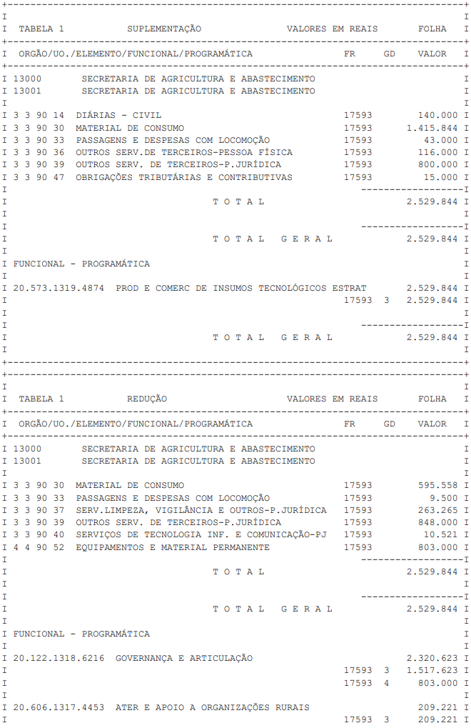 Artigo 1° - Fica aberto um crédito de R$ 2.529.844,00 (dois milhões, quinhentos e vinte e nove mil, oitocentos e quarenta e quatro reais), suplementar ao orçamento da Secretaria de Agricultura e Abastecimento, observando-se as classificações Institucional, Econômica, Funcional e Programática, conforme a Tabela 1, anexa.