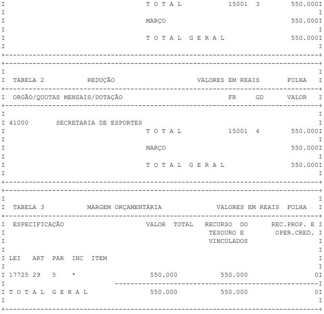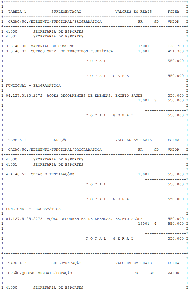 Artigo 1° - Fica aberto um crédito de R$ 550.000,00 (quinhentos e cinquenta mil reais), suplementar ao orçamento da Secretaria de Esportes, observando-se as classificações Institucional, Econômica, Funcional e Programática, conforme a Tabela 1, anexa.