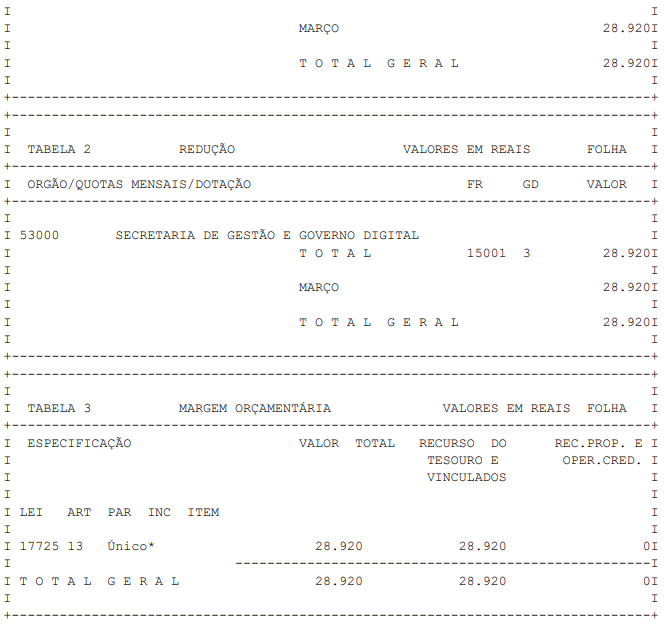 Artigo 1° - Fica aberto um crédito de R$ 28.920,00 (vinte e oito mil, novecentos e vinte reais), suplementar ao orçamento da Secretaria da Fazenda e Planejamento, observando-se as classificações Institucional, Econômica, Funcional e Programática, conforme a Tabela 1, anexa.