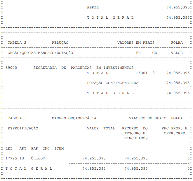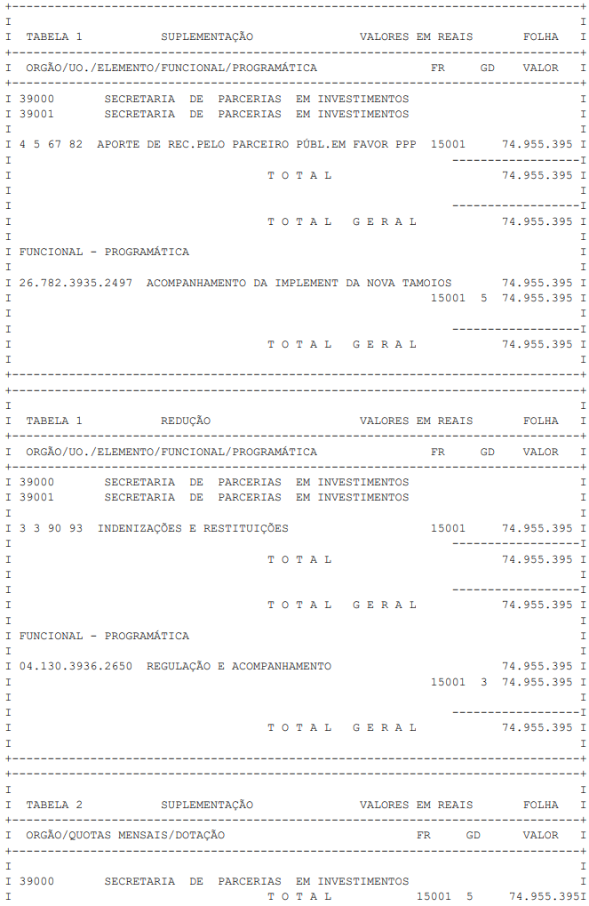 Artigo 1° - Fica aberto um crédito de R$ 74.955.395,00 (setenta e quatro milhões, novecentos e cinquenta e cinco mil, trezentos e noventa e cinco reais), suplementar ao orçamento da Secretaria de Parcerias em Investimentos, observando-se as classificações Institucional, Econômica, Funcional e Programática, conforme a Tabela 1, anexa.