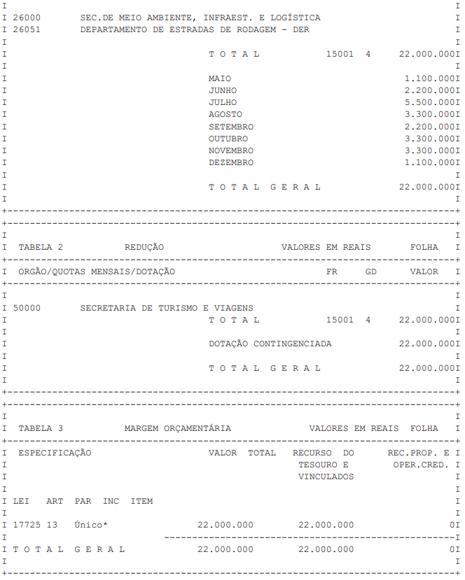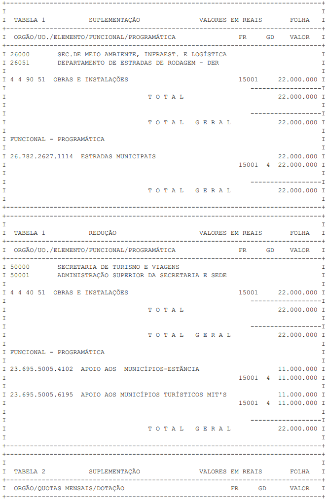 Artigo 1° - Fica aberto um crédito de R$ 22.000.000,00 (vinte e dois milhões de reais), suplementar ao orçamento da Departamento de Estradas de Rodagem - DER, observando-se as classificações Institucional, Econômica, Funcional e Programática, conforme a Tabela 1, anexa.