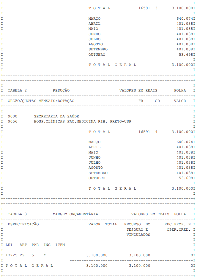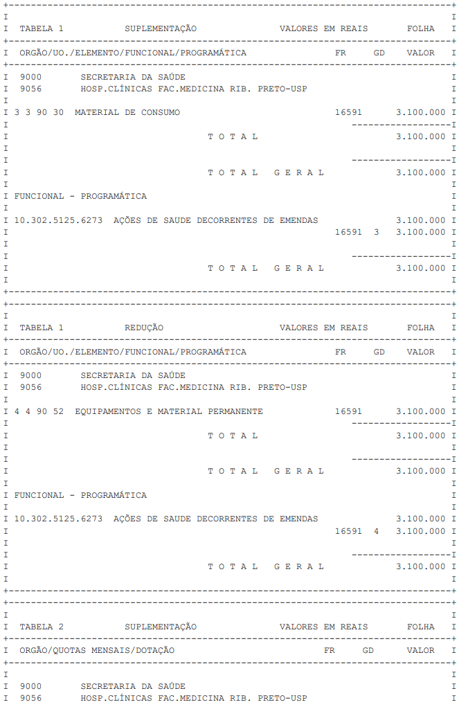Artigo 1° - Fica aberto um crédito de R$ 3.100.000,00 (três milhões e cem mil reais), suplementar ao orçamento do Hospital das Clínicas da Faculdade de Medicina de Ribeirão Preto da Universidade de São Paulo - USP, observando-se as classificações Institucional, Econômica, Funcional e Programática, conforme a Tabela 1, anexa.