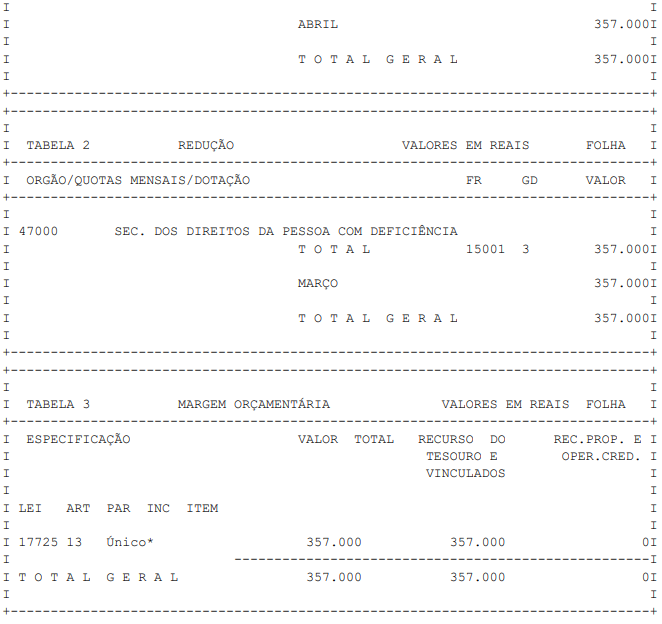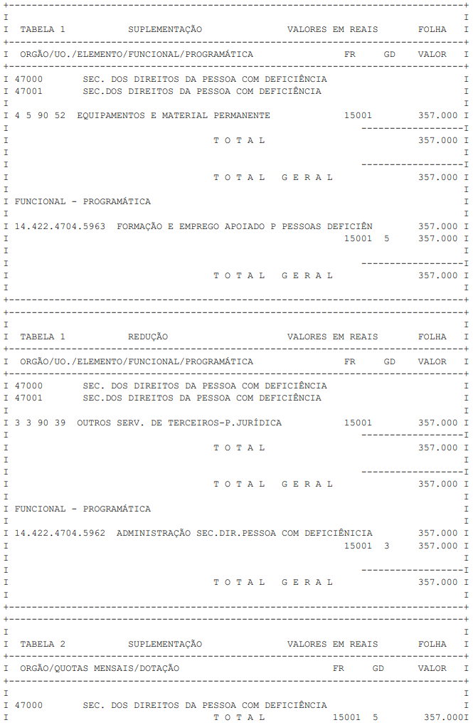 Artigo 1° - Fica aberto um crédito de R$ 357.000,00 (trezentos e cinquenta e sete mil reais), suplementar ao orçamento da Secretaria dos Direitos da Pessoa com Deficiência, observando-se as classificações Institucional, Econômica, Funcional e Programática, conforme a Tabela 1, anexa.
