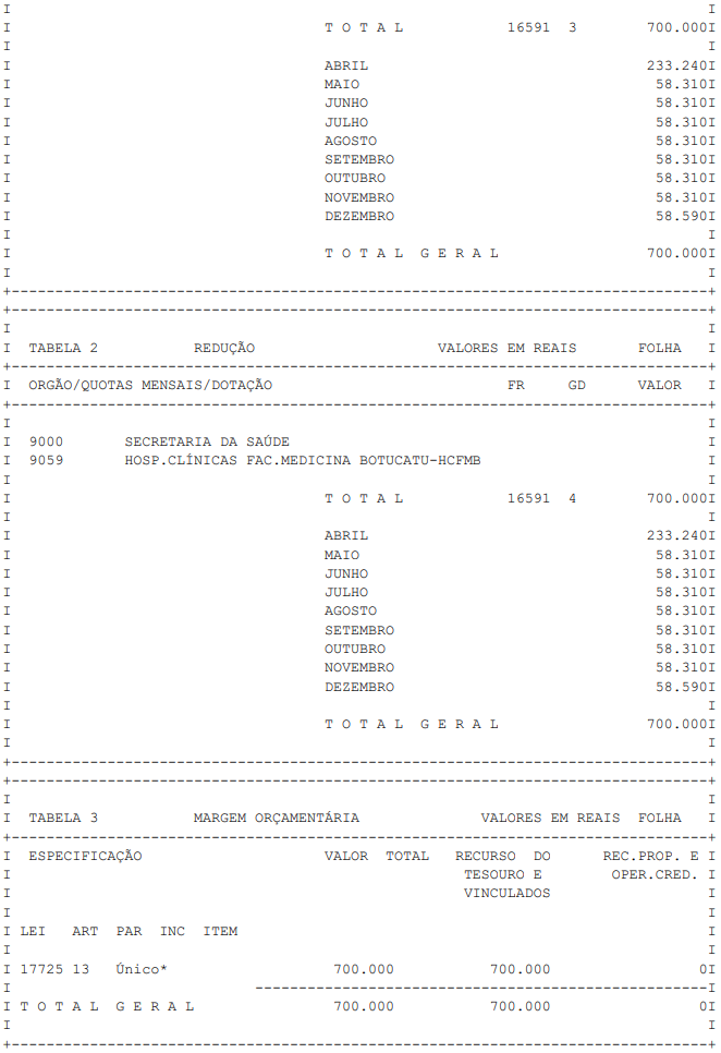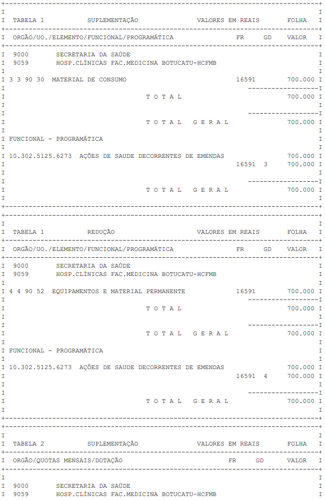 Artigo 1° - Fica aberto um crédito de R$ 700.000,00 (setecentos mil reais), suplementar ao orçamento do Hospital das Clínicas da Faculdade de Medicina de Botucatu-HCFMB, observando-se as classificações Institucional, Econômica, Funcional e Programática, conforme a Tabela 1, anexa.