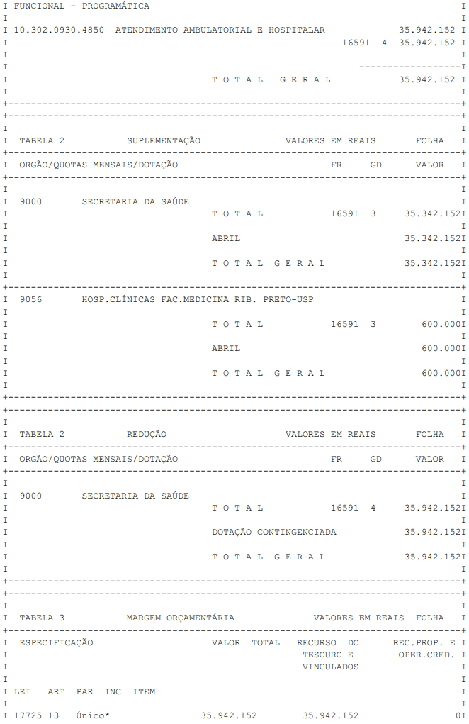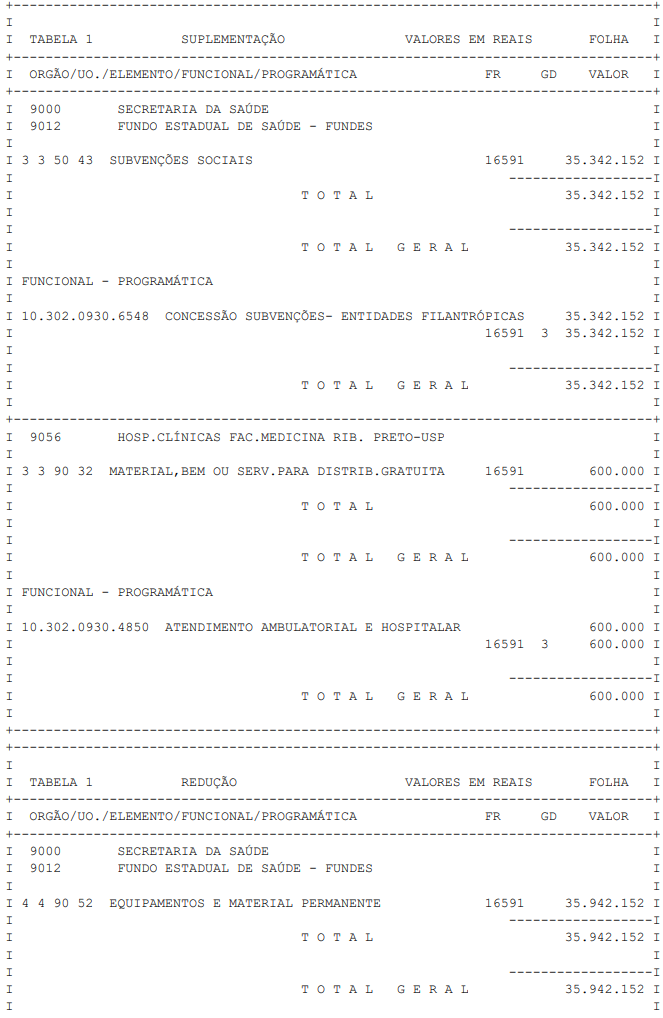 Artigo 1° - Fica aberto um crédito de R$ 35.942.152,00 (trinta e cinco milhões, novecentos e quarenta e dois mil, cento e cinquenta e dois reais), suplementar ao orçamento da Secretaria da Saúde, observando-se as classificações Institucional, Econômica, Funcional e Programática, conforme a Tabela 1, anexa.