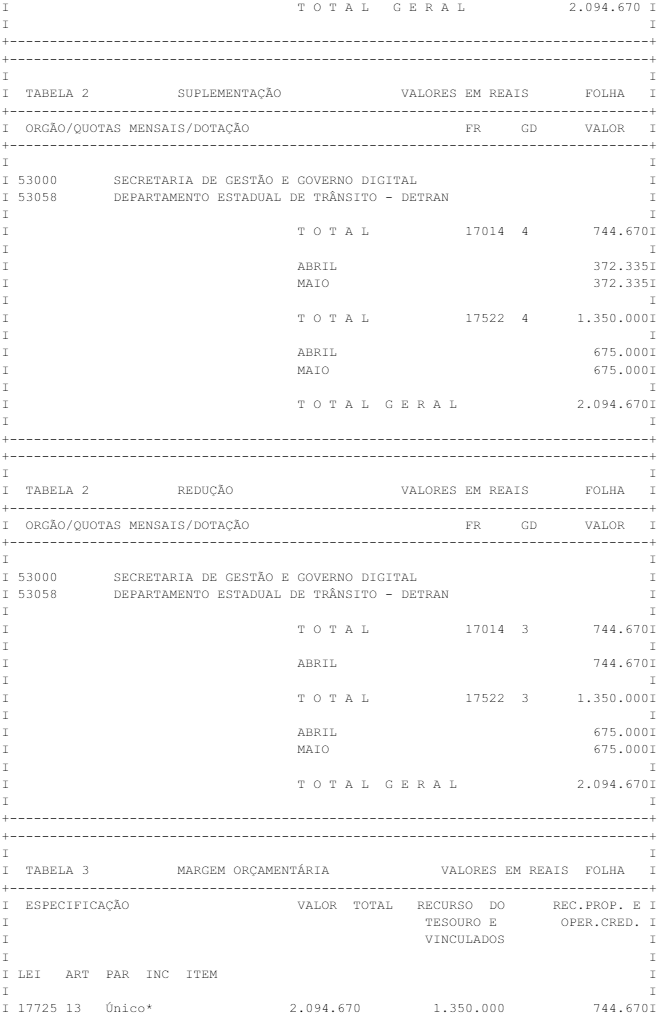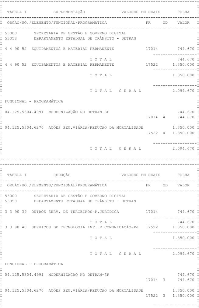 Artigo 1° - Fica aberto um crédito de R$ 2.094.670,00 (dois milhões, noventa e quatro mil, seiscentos e setenta reais), suplementar ao orçamento do Departamento Estadual de Trânsito - DETRAN, observando-se as classificações Institucional, Econômica, Funcional e Programática, conforme a Tabela 1, anexa.