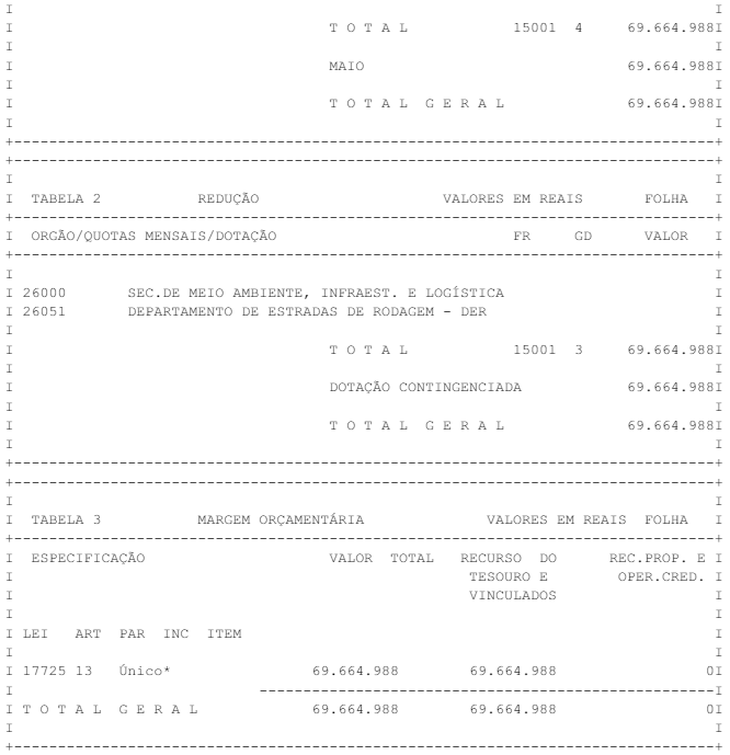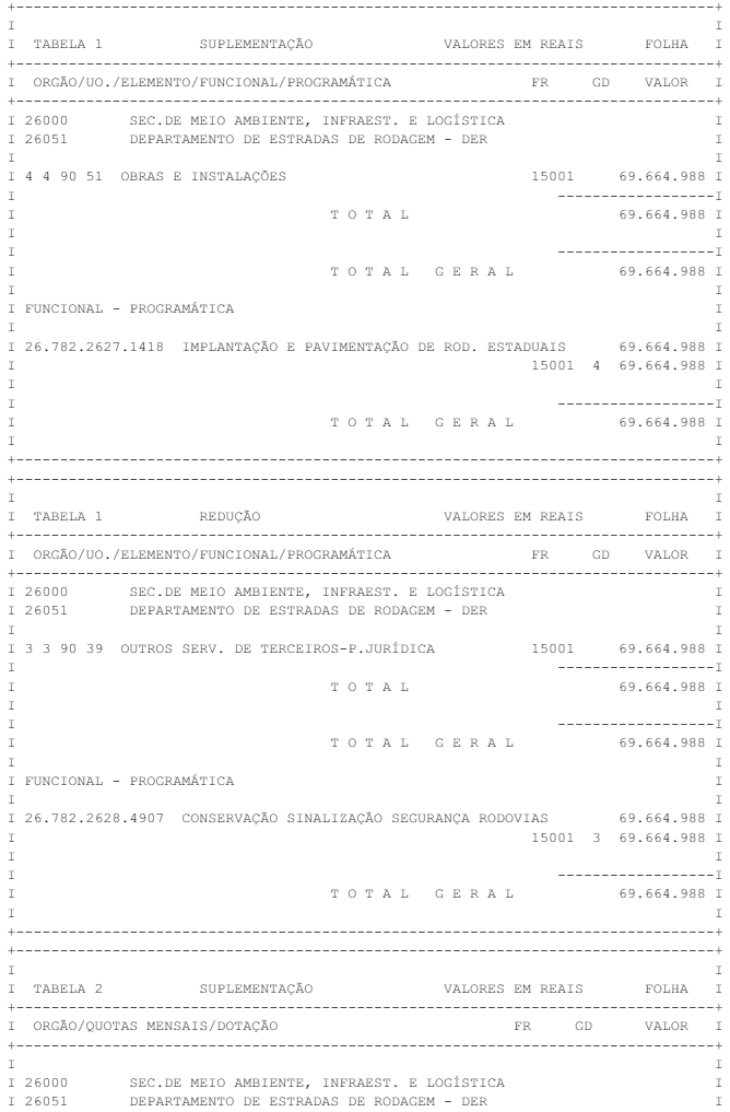 Artigo 1° - Fica aberto um crédito de R$ 69.664.988,00 (sessenta e nove milhões, seiscentos e sessenta e quatro mil, novecentos e oitenta e oito reais), suplementar ao orçamento do Departamento de Estradas de Rodagem - DER, observando-se as classificações Institucional, Econômica, Funcional e Programática, conforme a Tabela 1, anexa.