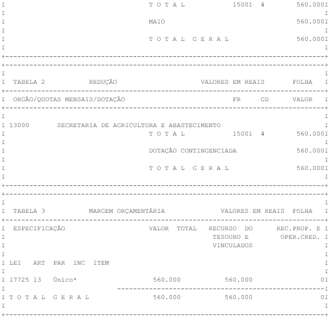 Artigo 1° - Fica aberto um crédito de R$ 560.000,00 (quinhentos e sessenta mil reais), suplementar ao orçamento da Secretaria de Agricultura e Abastecimento, observando-se as classificações Institucional, Econômica, Funcional e Programática, conforme a Tabela 1, anexa.