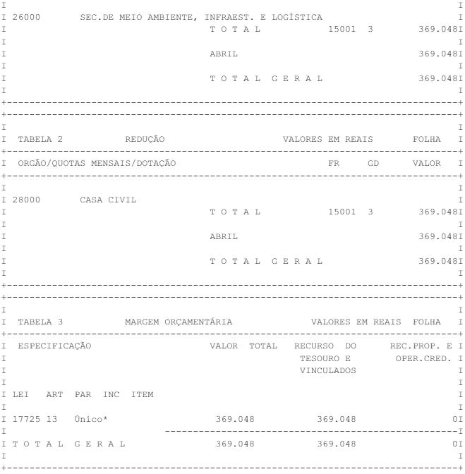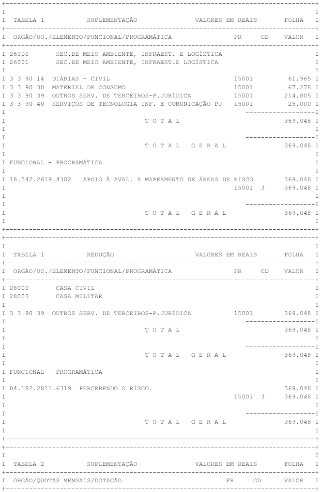 Artigo 1° - Fica aberto um crédito de R$ 369.048,00 (trezentos e sessenta e nove mil, quarenta e oito reais), suplementar ao orçamento da Secretaria de Meio Ambiente, Infraestrutura e Logística, observando-se as classificações Institucional, Econômica, Funcional e Programática, conforme a Tabela 1, anexa.