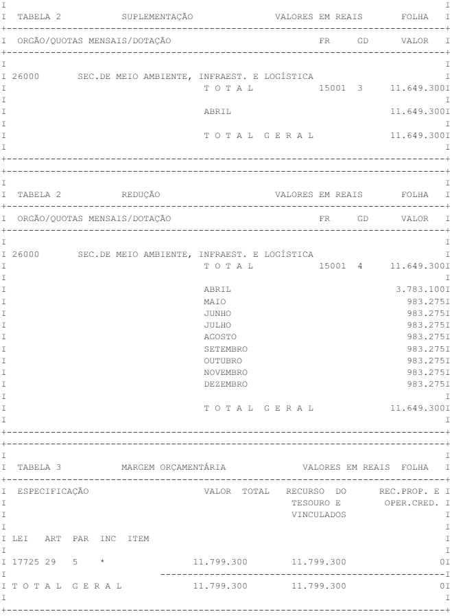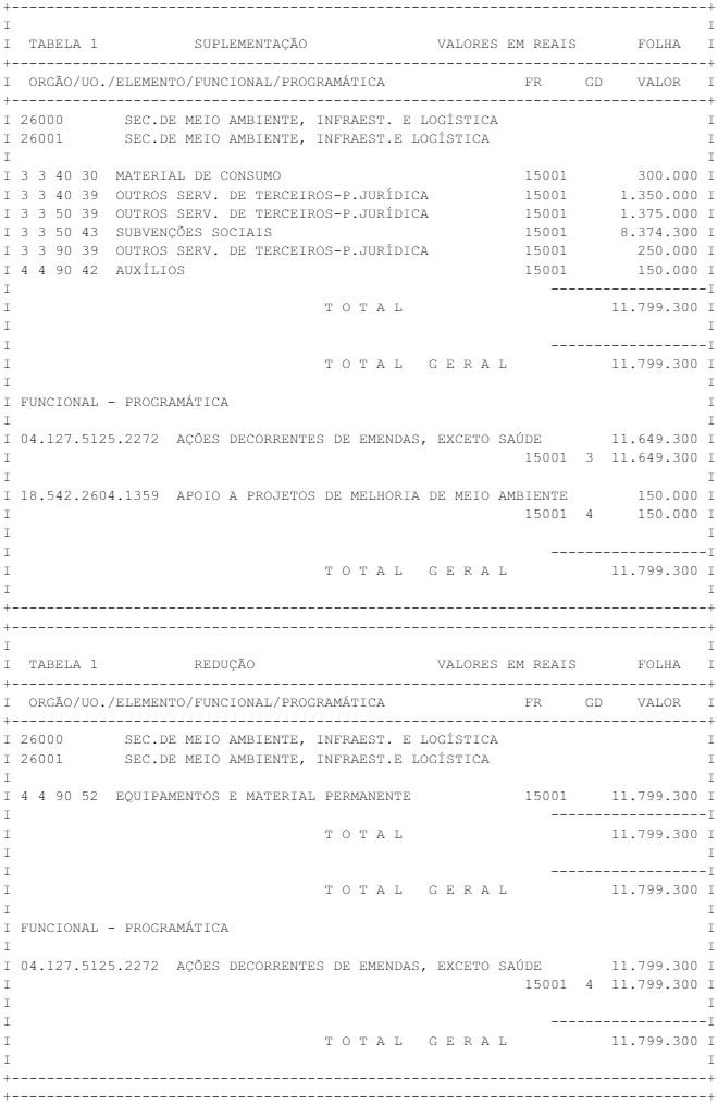 Artigo 1° - Fica aberto um crédito de R$ 11.799.300,00 (onze milhões, setecentos e noventa e nove mil, trezentos reais), suplementar ao orçamento da Secretaria de Meio Ambiente, Infraestrutura e Logística, observando-se as classificações Institucional, Econômica, Funcional e Programática, conforme a Tabela 1, anexa.
