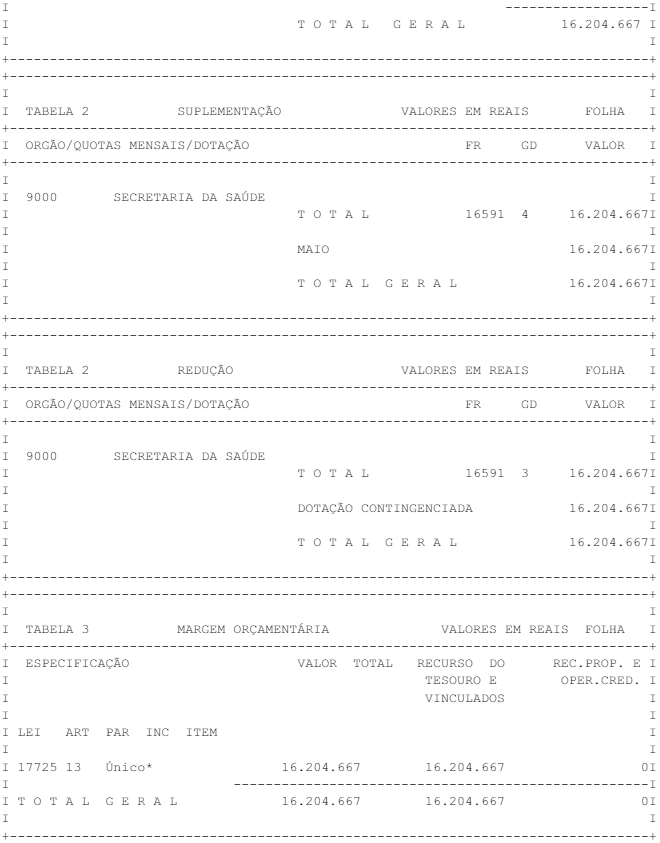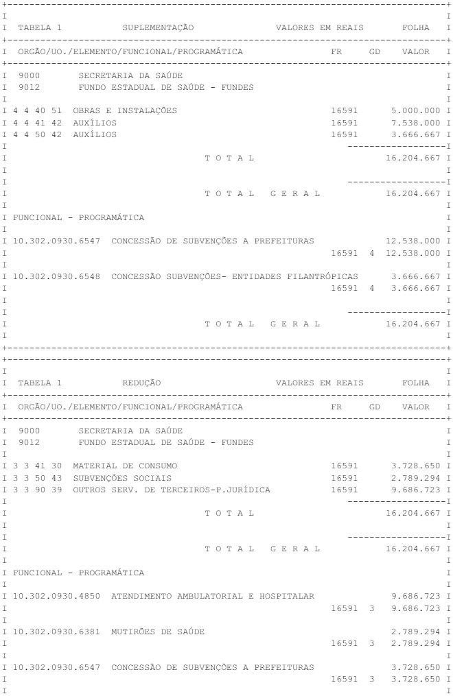 Artigo 1° - Fica aberto um crédito de R$ 16.204.667,00 (dezesseis milhões, duzentos e quatro mil, seiscentos e sessenta e sete reais), suplementar ao orçamento da Secretaria da Saúde, observando-se as classificações Institucional, Econômica, Funcional e Programática, conforme a Tabela 1, anexa.