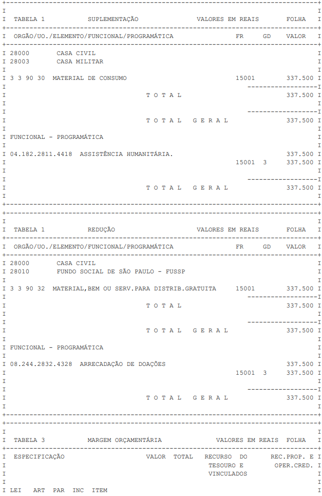 Artigo 1° - Fica aberto um crédito de R$ 337.500,00 (trezentos e trinta e sete mil, quinhentos reais), suplementar ao orçamento da Casa Civil, observando-se as classificações Institucional, Econômica, Funcional e Programática, conforme a Tabela 1, anexa.