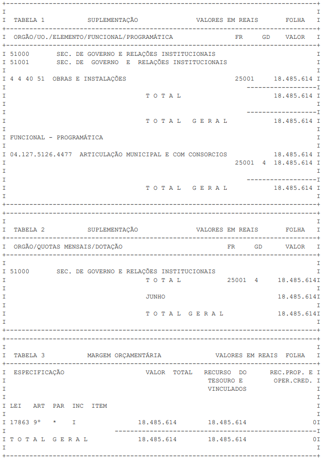 Artigo 1° - Fica aberto um crédito de R$ 18.485.614,00 (dezoito milhões, quatrocentos e oitenta e cinco mil, seiscentos e quatorze reais), suplementar ao orçamento da Secretaria de Governo e Relações Institucionais, observando-se as classificações Institucional, Econômica, Funcional e Programática, conforme a Tabela 1, anexa.