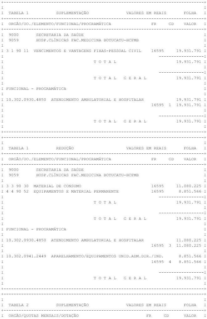 Artigo 1° - Fica aberto um crédito de R$ 19.931.791,00 (dezenove milhões, novecentos e trinta e um mil, setecentos e noventa e um reais), suplementar ao orçamento do Hospital das Clínicas da Faculdade de Medicina de Botucatu-HCFMB, observando-se as classificações Institucional, Econômica, Funcional e Programática, conforme a Tabela 1, anexa.