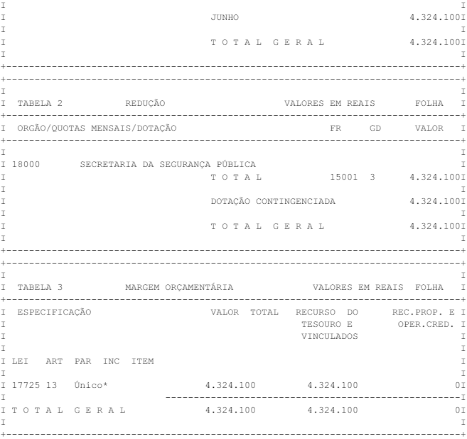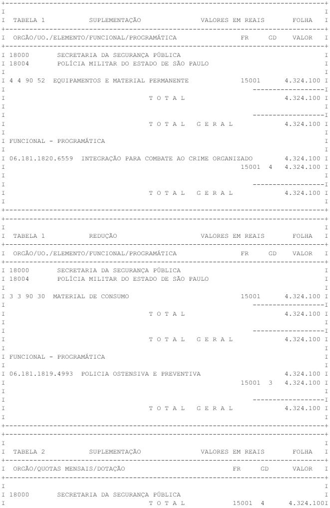 Artigo 1° - Fica aberto um crédito de R$ 4.324.100,00 (quatro milhões, trezentos e vinte e quatro mil, cem reais), suplementar ao orçamento da Secretaria da Segurança Pública, observando-se as classificações Institucional, Econômica, Funcional e Programática, conforme a Tabela 1, anexa.