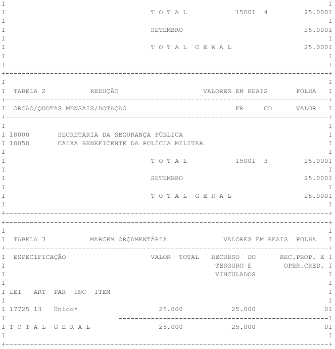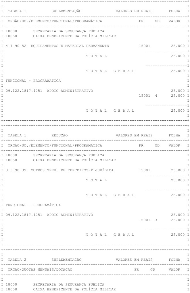Artigo 1° - Fica aberto um crédito de R$ 25.000,00 (vinte e cinco mil reais), suplementar ao orçamento da Caixa Beneficente da Polícia Militar, observando-se as classificações Institucional, Econômica, Funcional e Programática, conforme a Tabela 1, anexa.