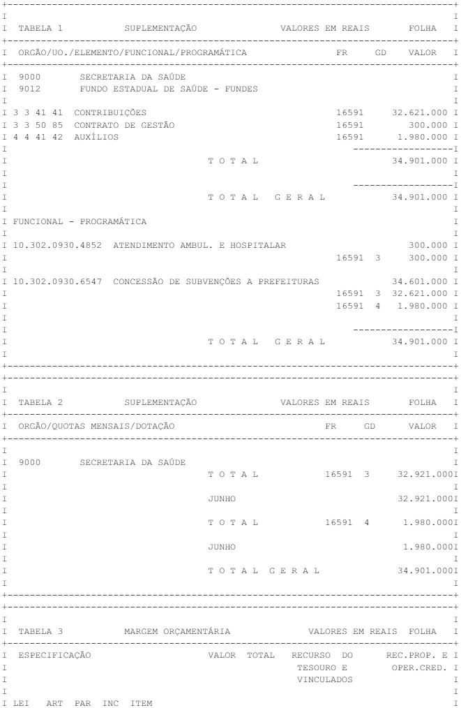 Artigo 1° - Fica aberto um crédito de R$ 34.901.000,00 (trinta e quatro milhões, novecentos e um mil reais), suplementar ao orçamento da Secretaria da Saúde, observando-se as classificações Institucional, Econômica, Funcional e Programática, conforme a Tabela 1, anexa.