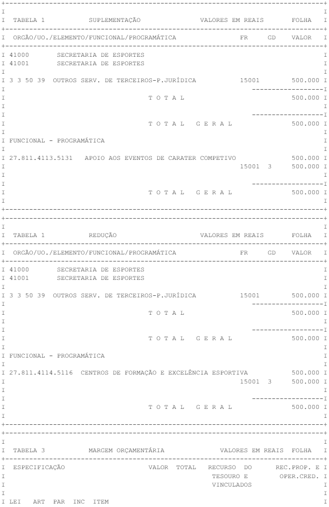 Artigo 1° - Fica aberto um crédito de R$ 500.000,00 (quinhentos mil reais), suplementar ao orçamento da Secretaria de Esportes, observando-se as classificações Institucional, Econômica, Funcional e Programática, conforme a Tabela 1, anexa.