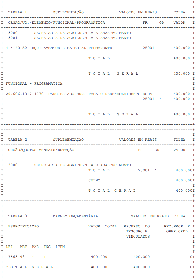 Artigo 1° - Fica aberto um crédito de R$ 400.000,00 (quatrocentos mil reais), suplementar ao orçamento da Secretaria de Agricultura e Abastecimento, observando-se as classificações Institucional, Econômica, Funcional e Programática, conforme a Tabela 1, anexa.