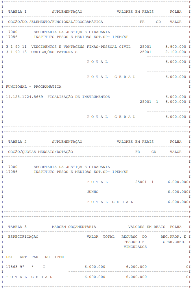 Artigo 1° - Fica aberto um crédito de R$ 6.000.000,00 (seis milhões de reais), suplementar ao orçamento do Instituto de Pesos e Medidas do Estado de São Paulo - IPEM/SP, observando-se as classificações Institucional, Econômica, Funcional e Programática, conforme a Tabela 1, anexa.