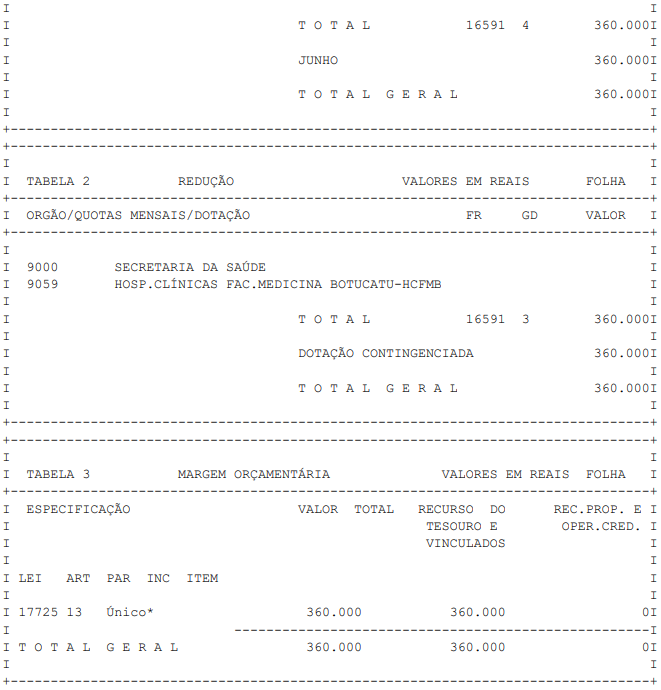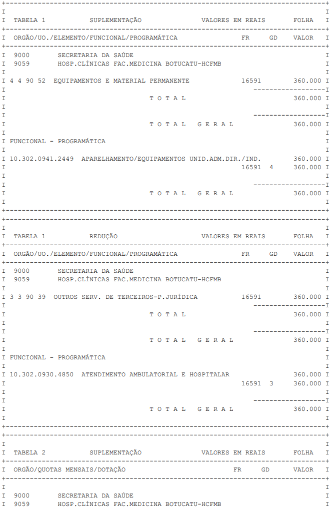 Artigo 1° - Fica aberto um crédito de R$ 360.000,00 (trezentos e sessenta mil reais), suplementar ao orçamento do Hospital das Clínicas da Faculdade de Medicina de Botucatu-HCFMB, observando-se as classificações Institucional, Econômica, Funcional e Programática, conforme a Tabela 1, anexa.