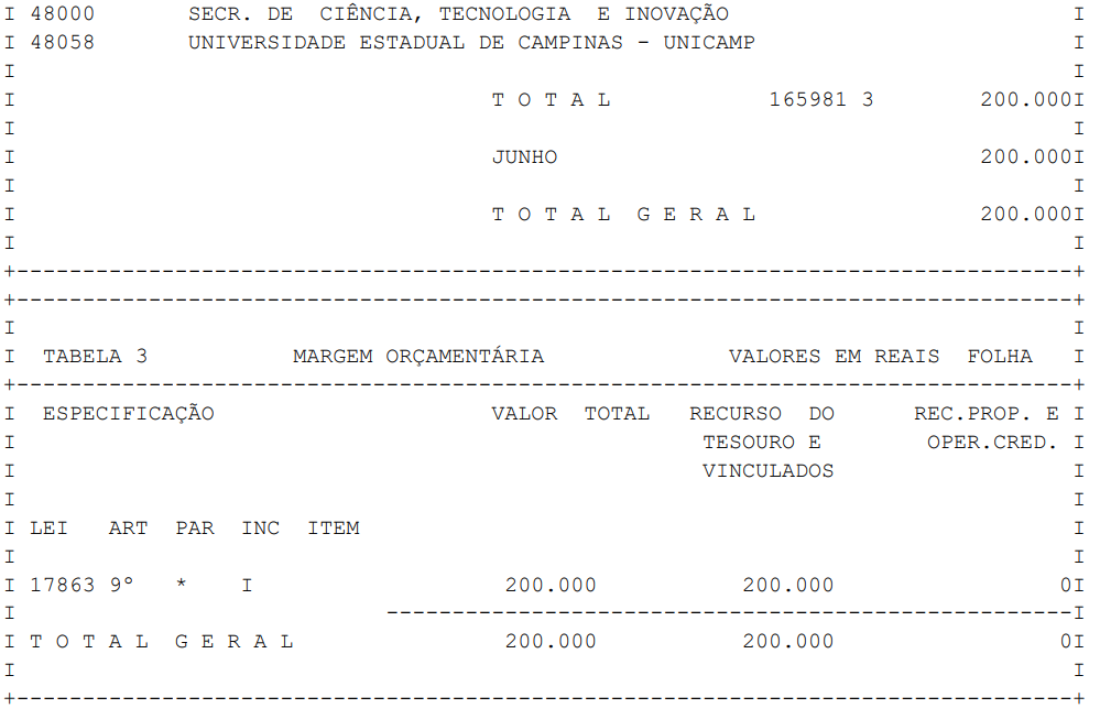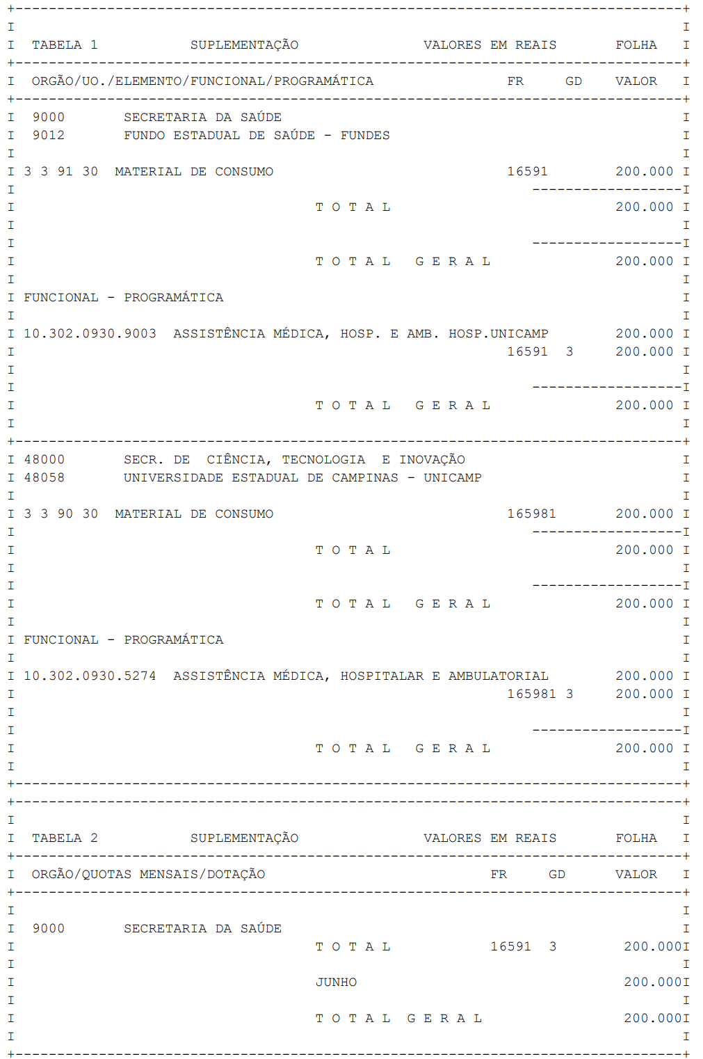 Artigo 1° - Fica aberto um crédito de R$ 200.000,00 (duzentos mil reais), suplementar ao orçamento da Universidade Estadual de Campinas-UNICAMP, observando-se as classificações Institucional, Econômica, Funcional e Programática, conforme a Tabela 1, anexa.