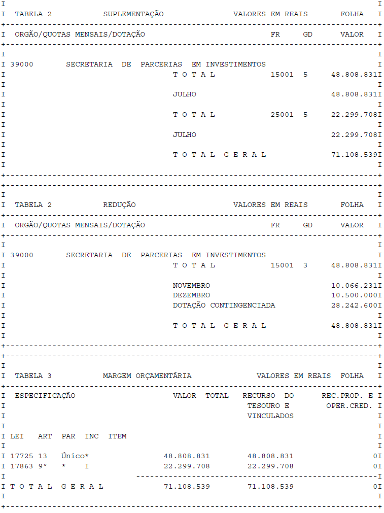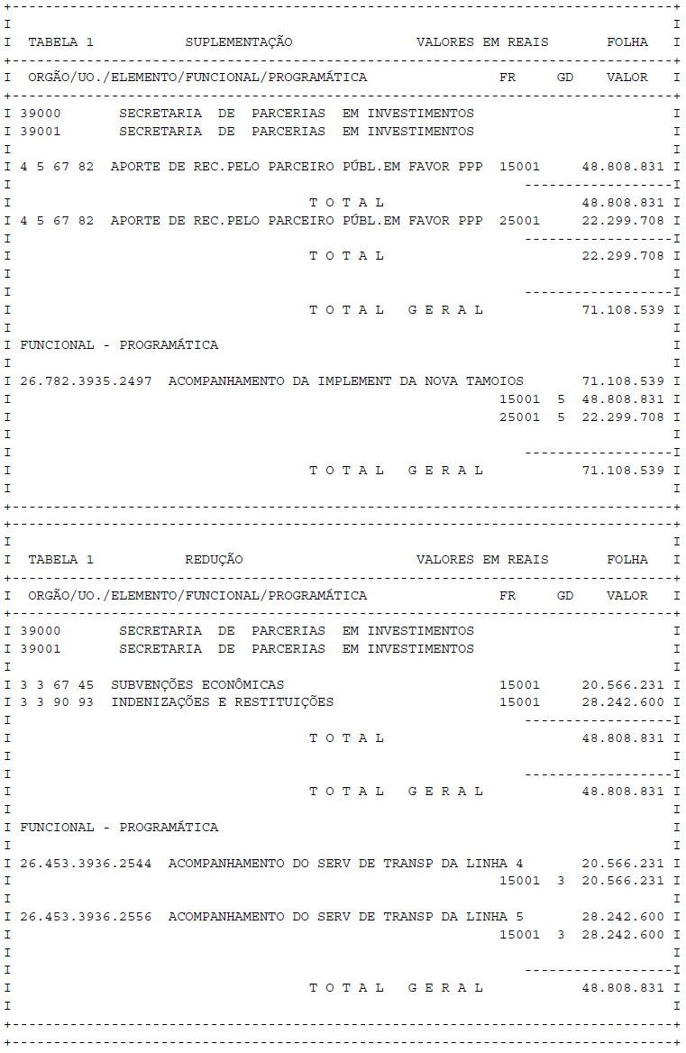Artigo 1° - Fica aberto um crédito de R$ 71.108.539,00 (setenta e um milhões, cento e oito mil, quinhentos e trinta e nove reais), suplementar ao orçamento da Secretaria de Parcerias em Investimentos, observando-se as classificações Institucional, Econômica, Funcional e Programática, conforme a Tabela 1, anexa.