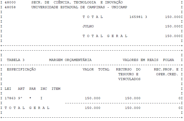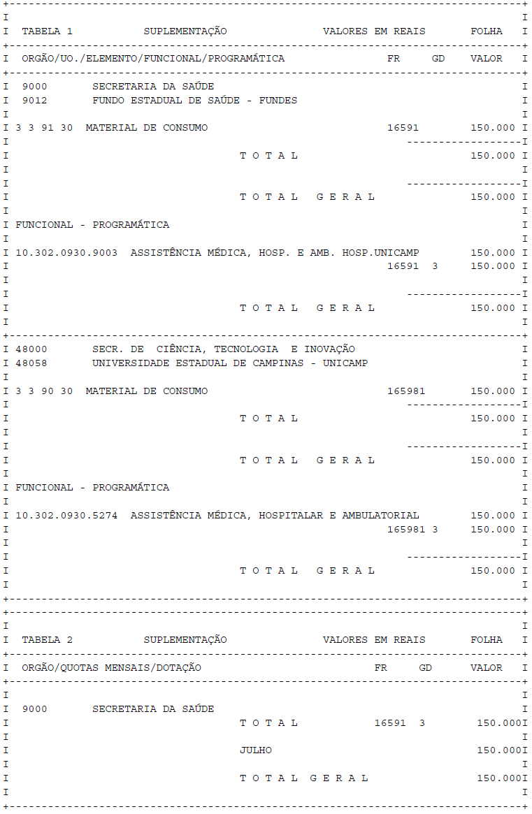 Artigo 1° - Fica aberto um crédito de R$ 150.000,00 (cento e cinquenta mil reais), suplementar ao orçamento da Universidade Estadual de Campinas-UNICAMP, observando-se as classificações Institucional, Econômica, Funcional e Programática, conforme a Tabela 1, anexa.