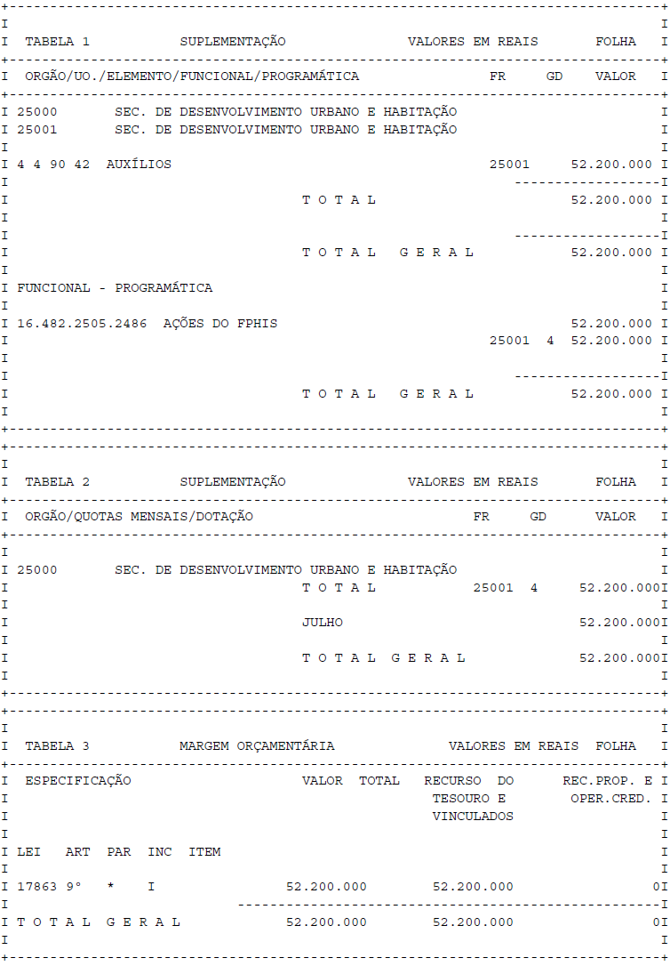 Artigo 1° - Fica aberto um crédito de R$ 52.200.000,00 (cinquenta e dois milhões, duzentos mil reais), suplementar ao orçamento da Secretaria de Desenvolvimento Urbano e Habitação, observando-se as classificações Institucional, Econômica, Funcional e Programática, conforme a Tabela 1, anexa.