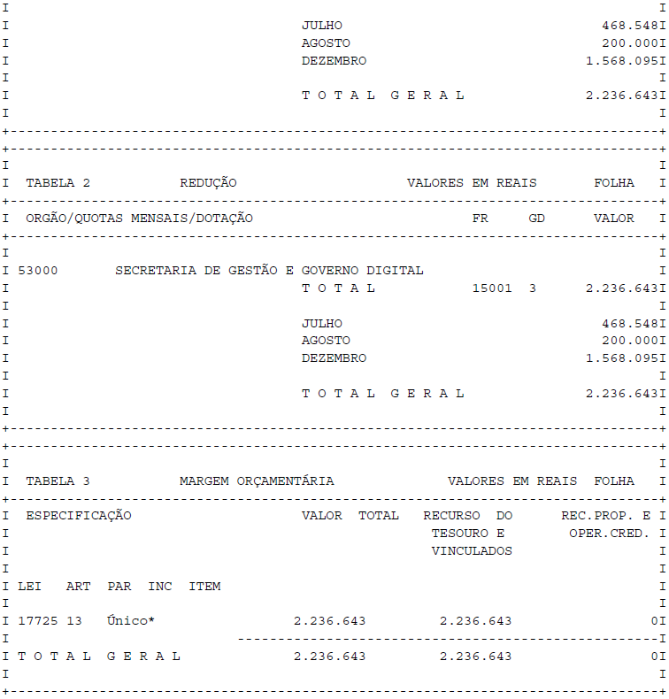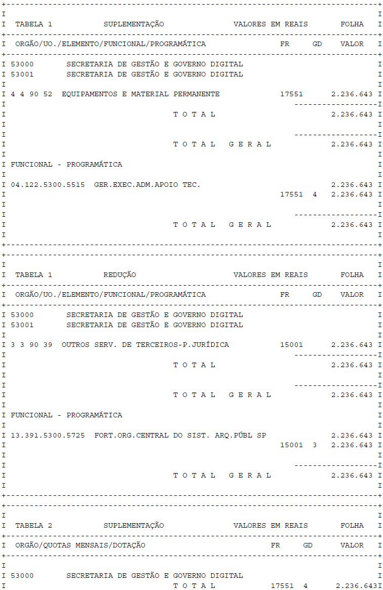 Artigo 1° - Fica aberto um crédito de R$ 2.236.643,00 (dois milhões, duzentos e trinta e seis mil, seiscentos e quarenta e três reais), suplementar ao orçamento da Secretaria de Gestão e Governo Digital, observando-se as classificações Institucional, Econômica, Funcional e Programática, conforme a Tabela 1, anexa.