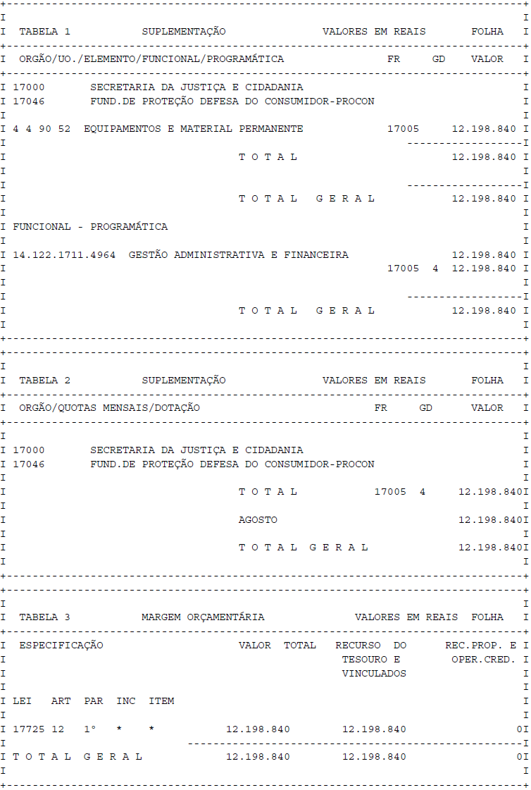 Artigo 1° - Fica aberto um crédito de R$ 12.198.840,00 (doze milhões, cento e noventa e oito mil, oitocentos e quarenta reais), suplementar ao orçamento da Fundação de Proteção e Defesa do Consumidor - PROCON, observando-se as classificações Institucional, Econômica, Funcional e Programática, conforme a Tabela 1, anexa.