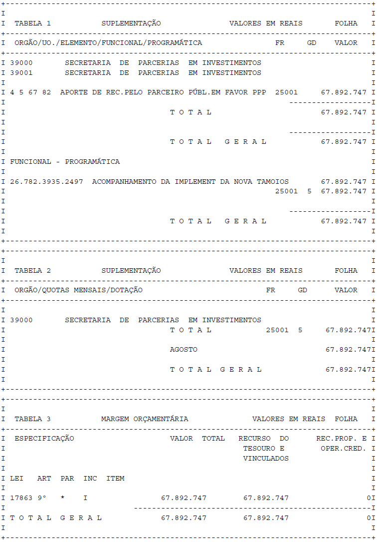 Artigo 1° - Fica aberto um crédito de R$ 67.892.747,00 (sessenta e sete milhões, oitocentos e noventa e dois mil, setecentos e quarenta e sete reais), suplementar ao orçamento da Secretaria de Parcerias em Investimentos, observando-se as classificações Institucional, Econômica, Funcional e Programática, conforme a Tabela 1, anexa.
