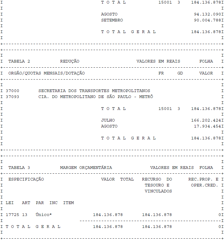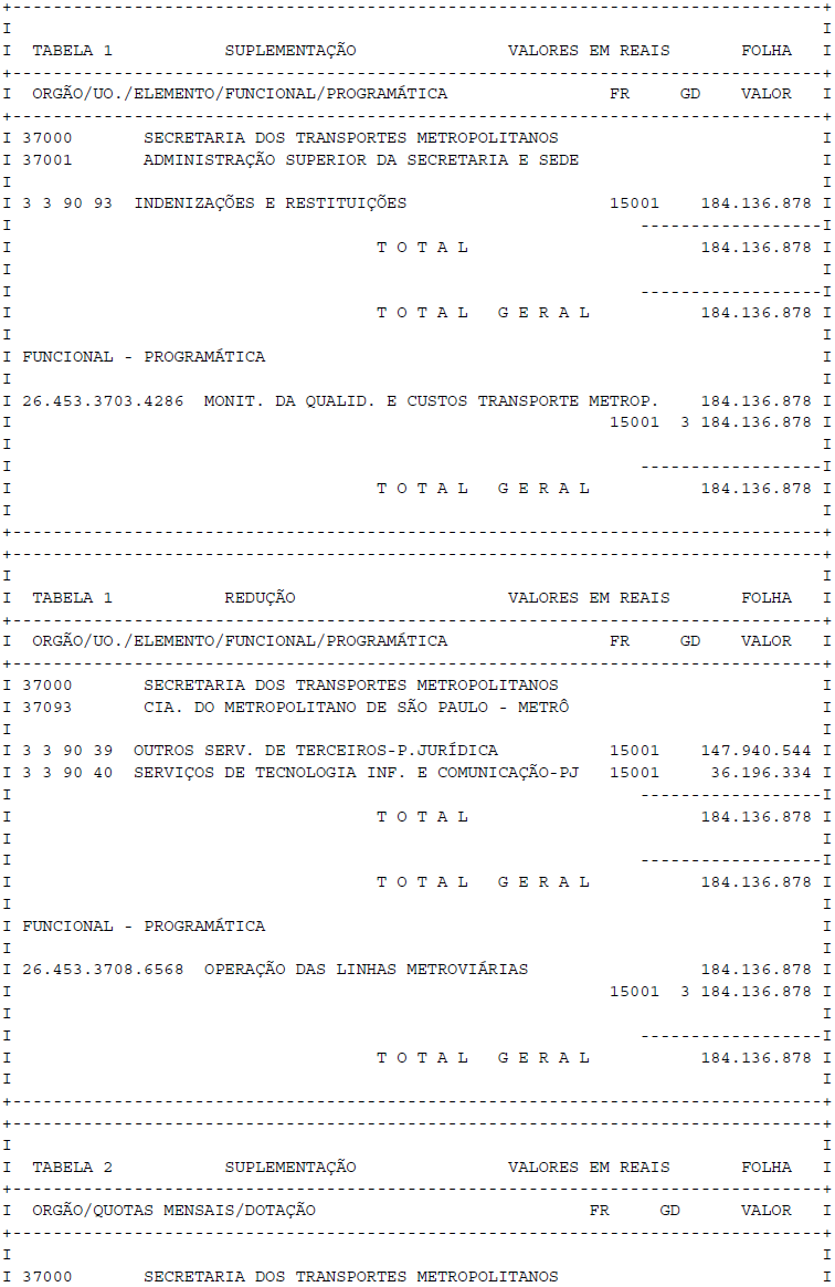 Artigo 1° - Fica aberto um crédito de R$ 184.136.878,00 (cento e oitenta e quatro milhões, cento e trinta e seis mil, oitocentos e setenta e oito reais), suplementar ao orçamento da Secretaria dos Transportes Metropolitanos, observando-se as classificações Institucional, Econômica, Funcional e Programática, conforme a Tabela 1, anexa.