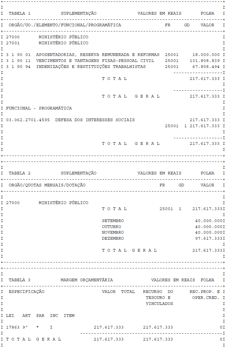 Artigo 1° - Fica aberto um crédito de R$ 217.617.333,00 (duzentos e dezessete milhões, seiscentos e dezessete mil, trezentos e trinta e três reais), suplementar ao orçamento do Ministério Público, observando-se as classificações Institucional, Econômica, Funcional e Programática, conforme a Tabela 1, anexa.