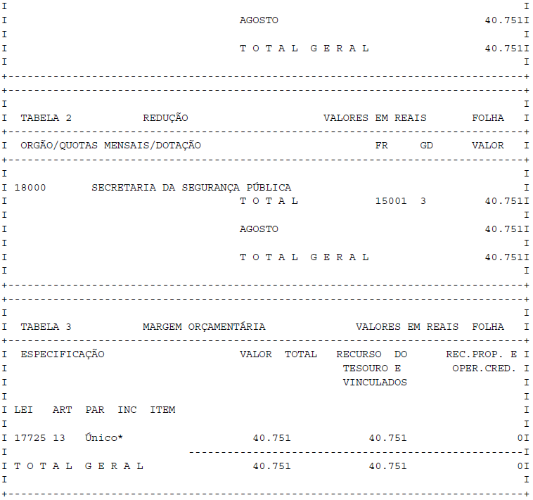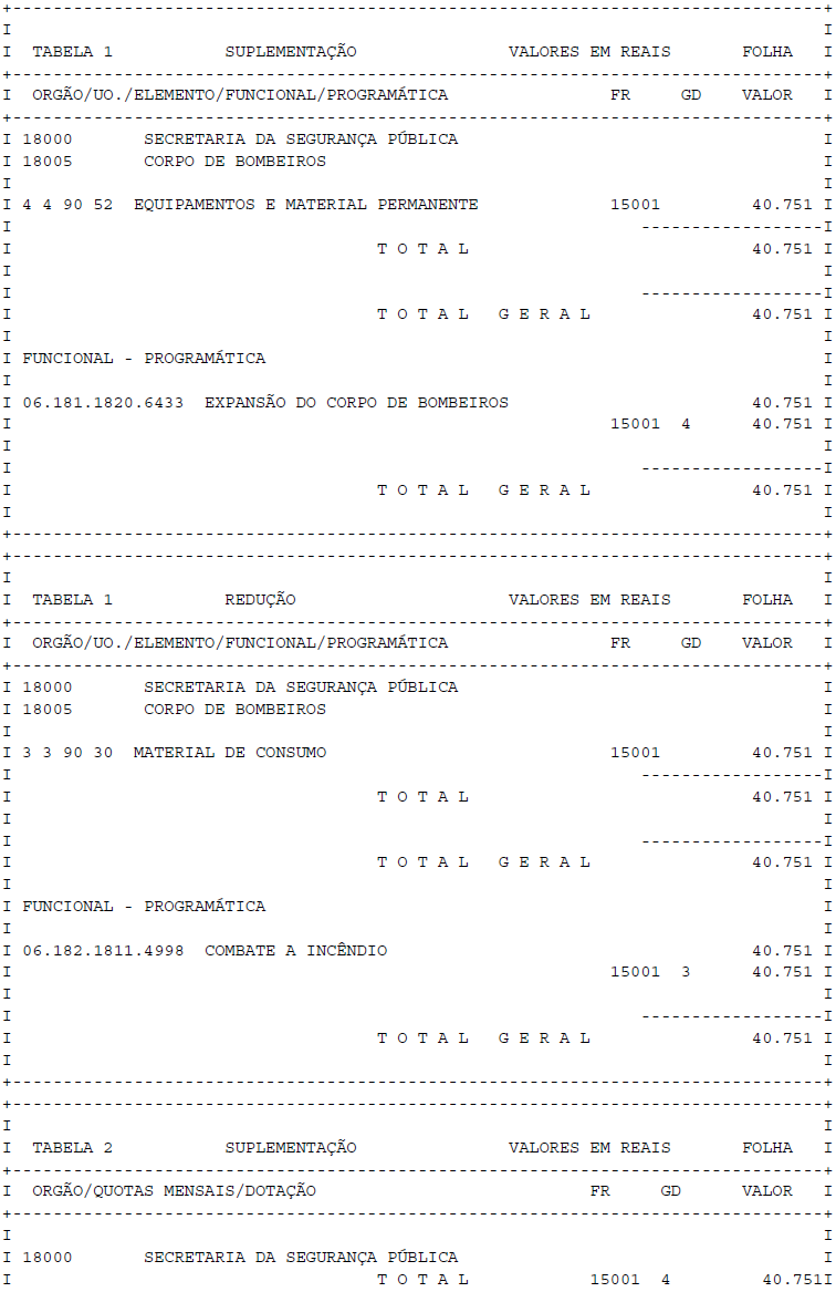 Artigo 1° - Fica aberto um crédito de R$ 40.751,00 (quarenta mil, setecentos e cinquenta e um reais), suplementar ao orçamento da Secretaria da Segurança Pública, observando-se as classificações Institucional, Econômica, Funcional e Programática, conforme a Tabela 1, anexa.