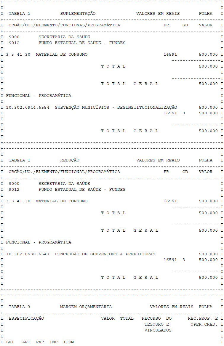 Artigo 1° - Fica aberto um crédito de R$ 500.000,00 (quinhentos mil reais), suplementar ao orçamento da Secretaria da Saúde, observando-se as classificações Institucional, Econômica, Funcional e Programática, conforme a Tabela 1, anexa.