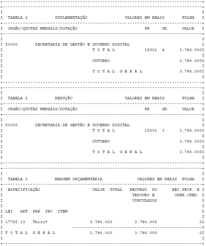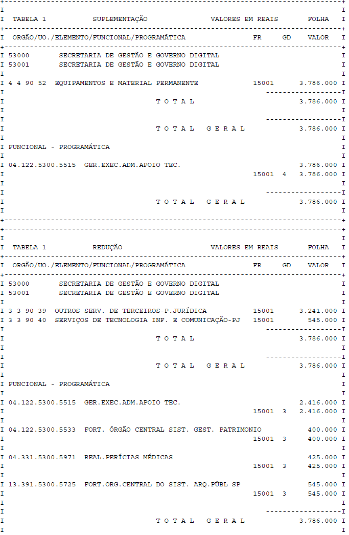 Artigo 1° - Fica aberto um crédito de R$ 3.786.000,00 (três milhões setecentos e oitenta e seis mil reais), suplementar ao orçamento da Secretaria de Gestão e Governo Digital, observando-se as classificações Institucional, Econômica, Funcional e Programática, conforme a Tabela 1, anexa.