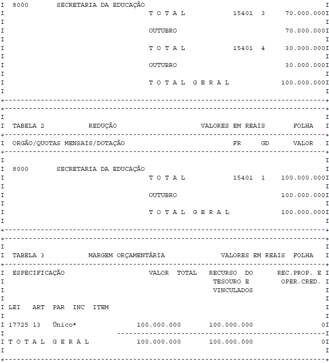 Artigo 1° - Fica aberto um crédito de R$ 100.000.000,00 (cem milhões de reais), suplementar ao orçamento da Secretaria da Educação, observando-se as classificações Institucional, Econômica, Funcional e Programática, conforme a Tabela 1, anexa.