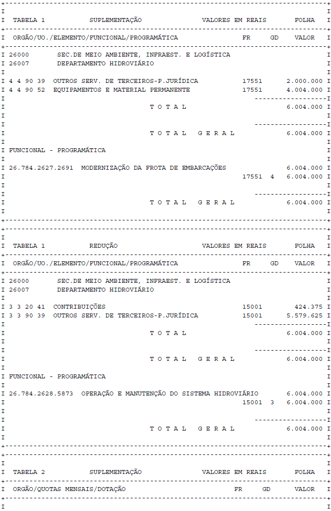 Artigo 1° - Fica aberto um crédito de R$ 6.004.000,00 (seis milhões e quatro mil reais), suplementar ao orçamento da Secretaria de Meio Ambiente, Infraestrutura e Logística, observando-se as classificações Institucional, Econômica, Funcional e Programática, conforme a Tabela 1, anexa.