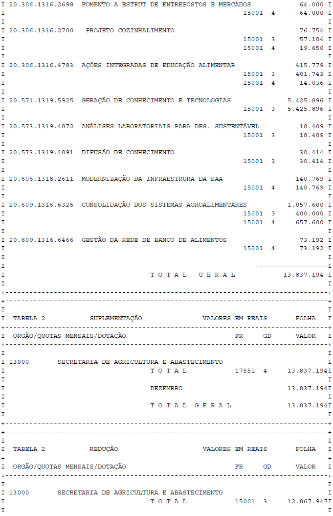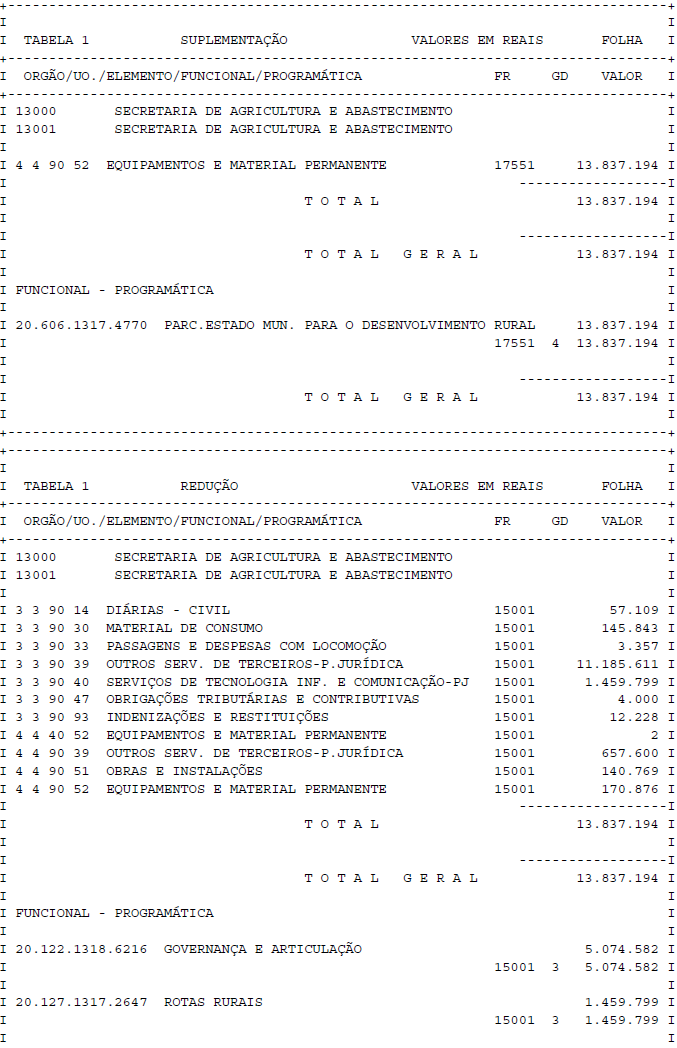 Artigo 1° - Fica aberto um crédito de R$ 13.837.194,00 (treze milhões, oitocentos e trinta e sete mil, cento e noventa e quatro reais), suplementar ao orçamento da Secretaria de Agricultura e Abastecimento, observando-se as classificações Institucional, Econômica, Funcional e Programática, conforme a Tabela 1, anexa.