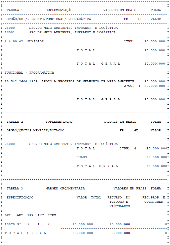 Artigo 1° - Fica aberto um crédito de R$ 30.000.000,00 (trinta milhões de reais), suplementar ao orçamento da Secretaria de Meio Ambiente, Infraestrutura e Logística, observando-se as classificações Institucional, Econômica, Funcional e Programática, conforme a Tabela 1, anexa.