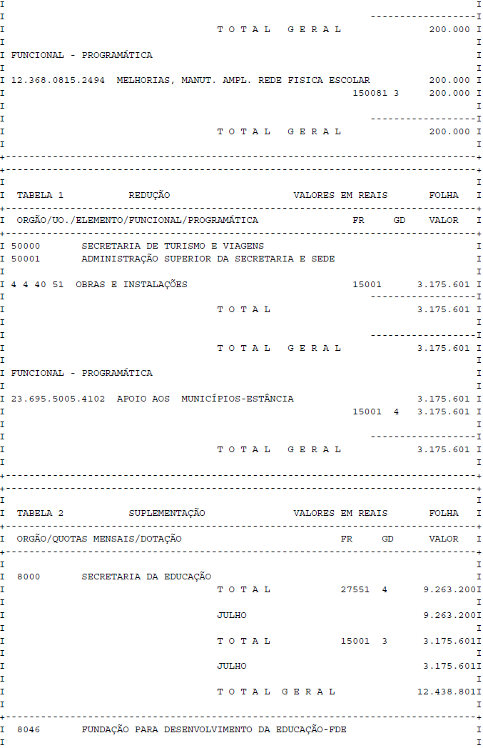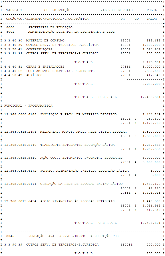 Artigo 1° - Fica aberto um crédito de R$ 12.438.801,00 (doze milhões, quatrocentos e trinta e oito mil, oitocentos e um reais), suplementar ao orçamento da Secretaria da Educação, observando-se as classificações Institucional, Econômica, Funcional e Programática, conforme a Tabela 1, anexa.