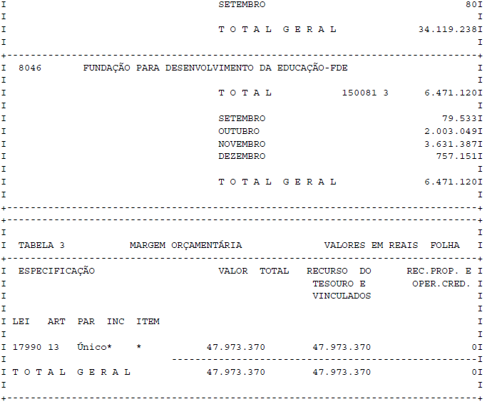 Artigo 1° - Fica aberto um crédito de R$ 47.973.370,00 (quarenta e sete milhões, novecentos e setenta e três mil, trezentos e setenta reais), suplementar ao orçamento da Secretaria da Educação, observando-se as classificações Institucional, Econômica, Funcional e Programática, conforme a Tabela 1, anexa.