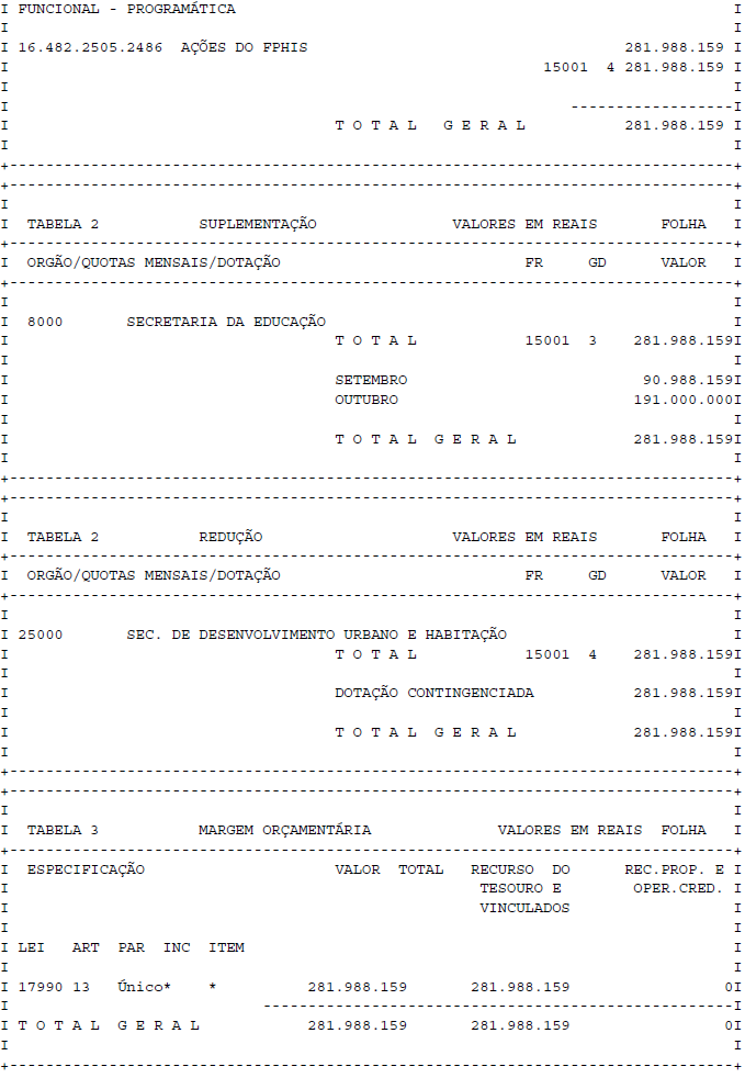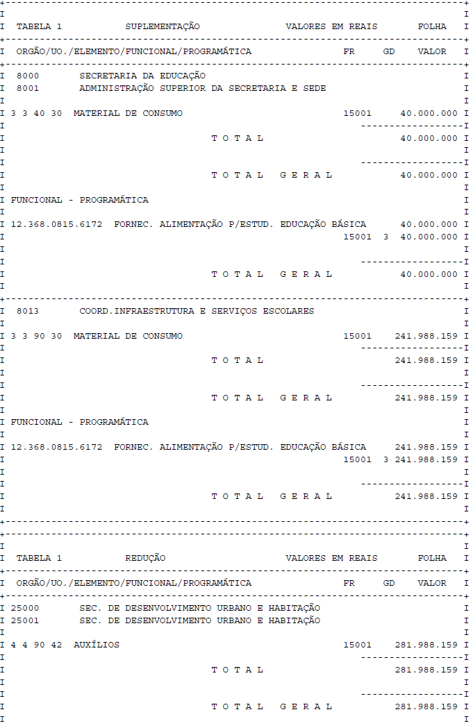 Artigo 1° - Fica aberto um crédito de R$ 281.988.159,00 (duzentos e oitenta e um milhões, novecentos e oitenta e oito mil, cento e cinquenta e nove reais), suplementar ao orçamento da Secretaria da Educação, observando-se as classificações Institucional, Econômica, Funcional e Programática, conforme a Tabela 1, anexa.
